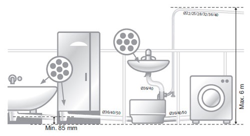 Если правильно продумать систему и купить малогабаритную сантехническую установку можно избежать лишних затрат на дорогостоящие работы и обойтись без покупки дополнительных труб.